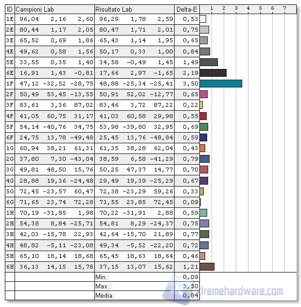 Migliore delle aspettative è la fedeltà cromatica registrata nelle condizioni out-of-box. La media del Delta-E è risultata di appena 0,84, già migliore a quello degli altri monitor fin qui testati dopo l’avvenuta calibrazione.