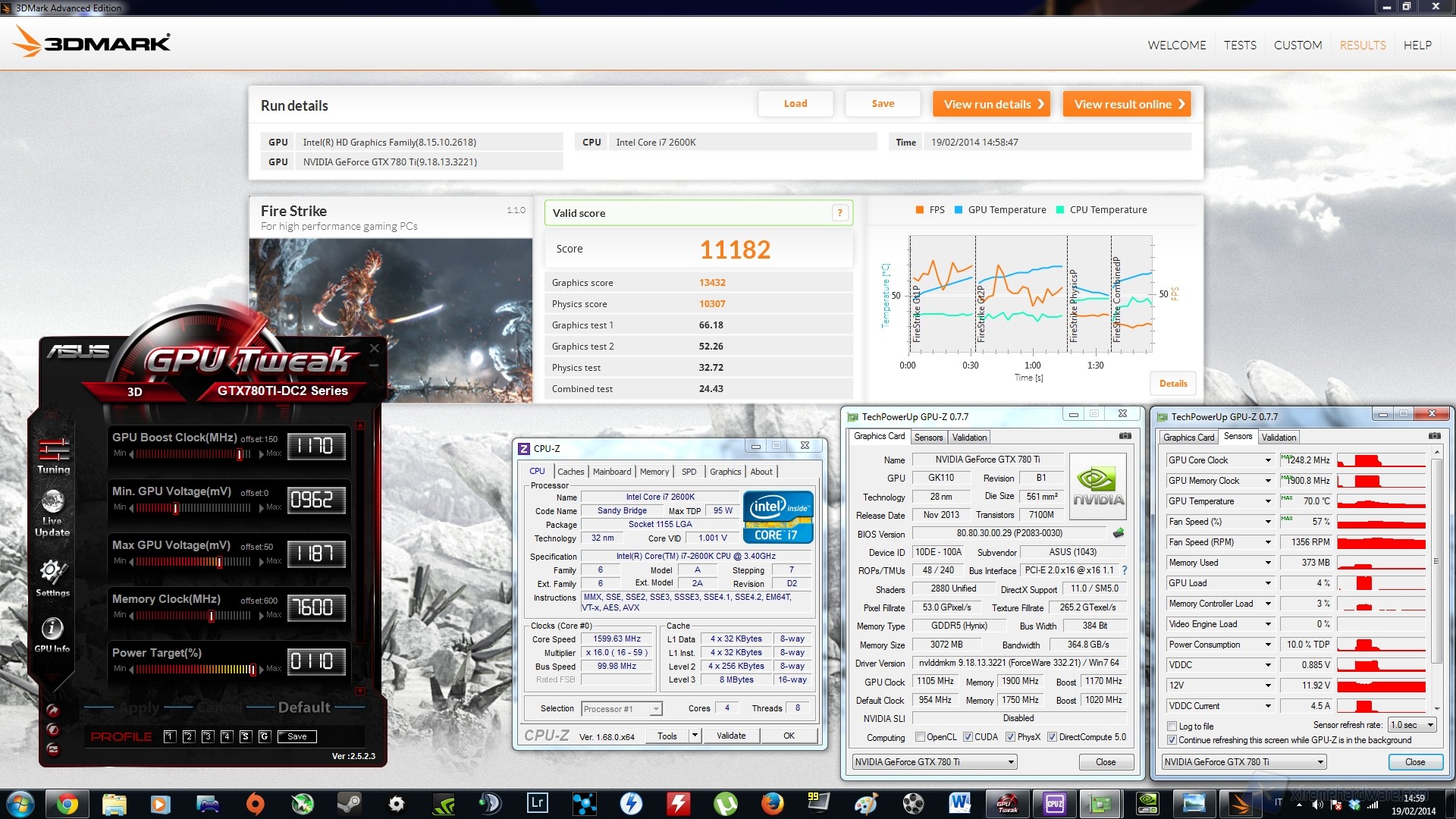 Andiamo ora a vedere come si comporta questa scheda in overclock. L’overclock, per chi non lo sapesse, consiste nel perseguire il miglioramento delle prestazioni di un componente elettronico di un elaboratore (in genere una CPU) mediante l'aumento della frequenza di clock rispetto a quella prevista dal produttore. La ASUS GTX 780 Ti DCII OC, come si può dedurre dal nome, presenta un overclock di fabbrica di 79 MHz Base clock / 92 MHz Boost clock per quanto riguarda il core, mentre le memorie sono lasciate a frequenza stock di 7000 MHz. Dalle frequenze stock di core e memorie siamo arrivati rispettivamente a 1170/7600 MHz. Queste frequenze sono state ottenute aumentando il voltaggio del core di +50 mentre le memorie sono state lasciate a voltaggio stock, abbiamo aumentato inoltre il Power Limit a 110. Le memorie che equipaggiano questa scheda sono delle Hynix, quindi abbastanza propense a salire di frequenze anche se per maggiori potenzialità di OC di solito si preferiscono RAM Samsung. Con queste frequenze abbiamo chiuso di nuovo il test del 3DMark 2013 ottenendo questi risultati: